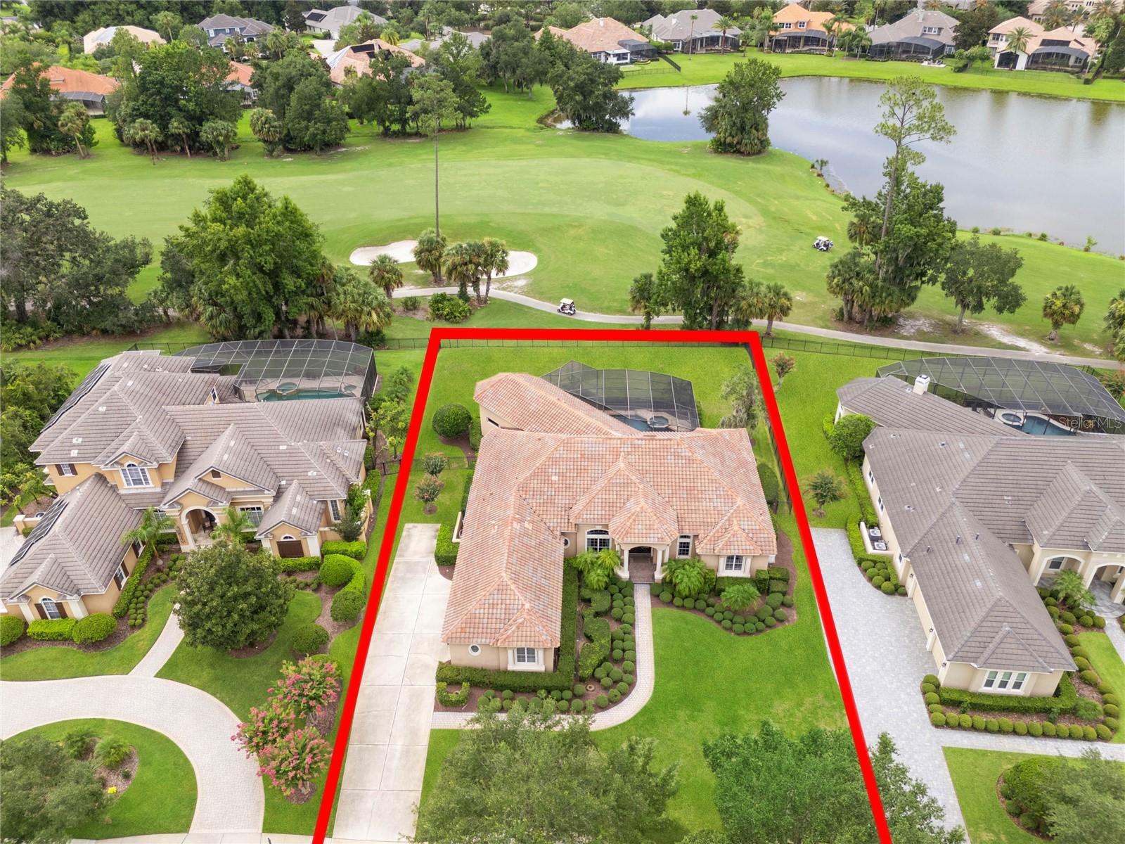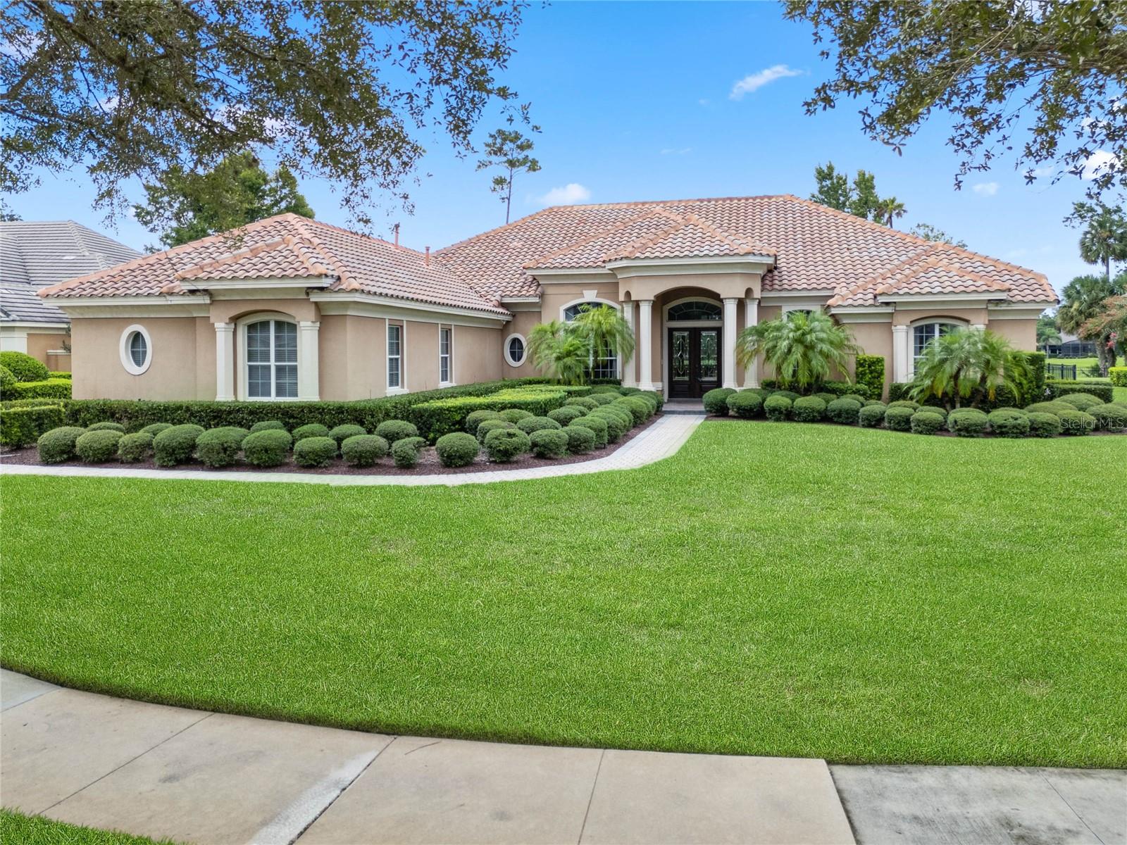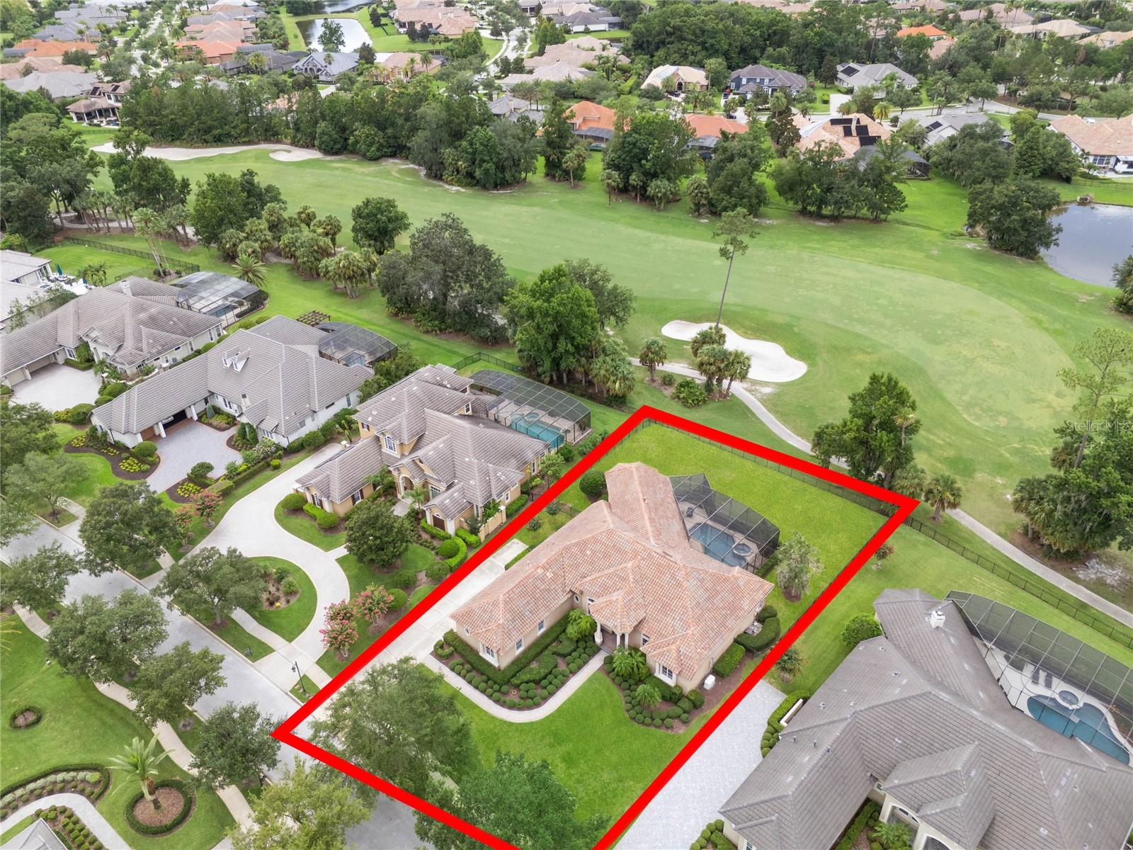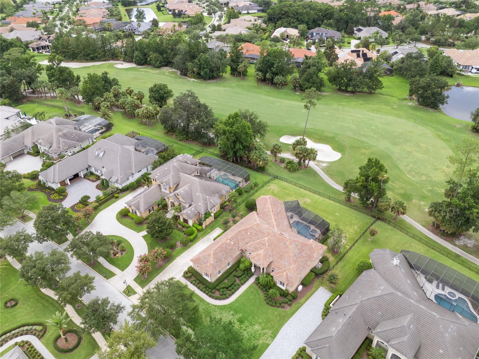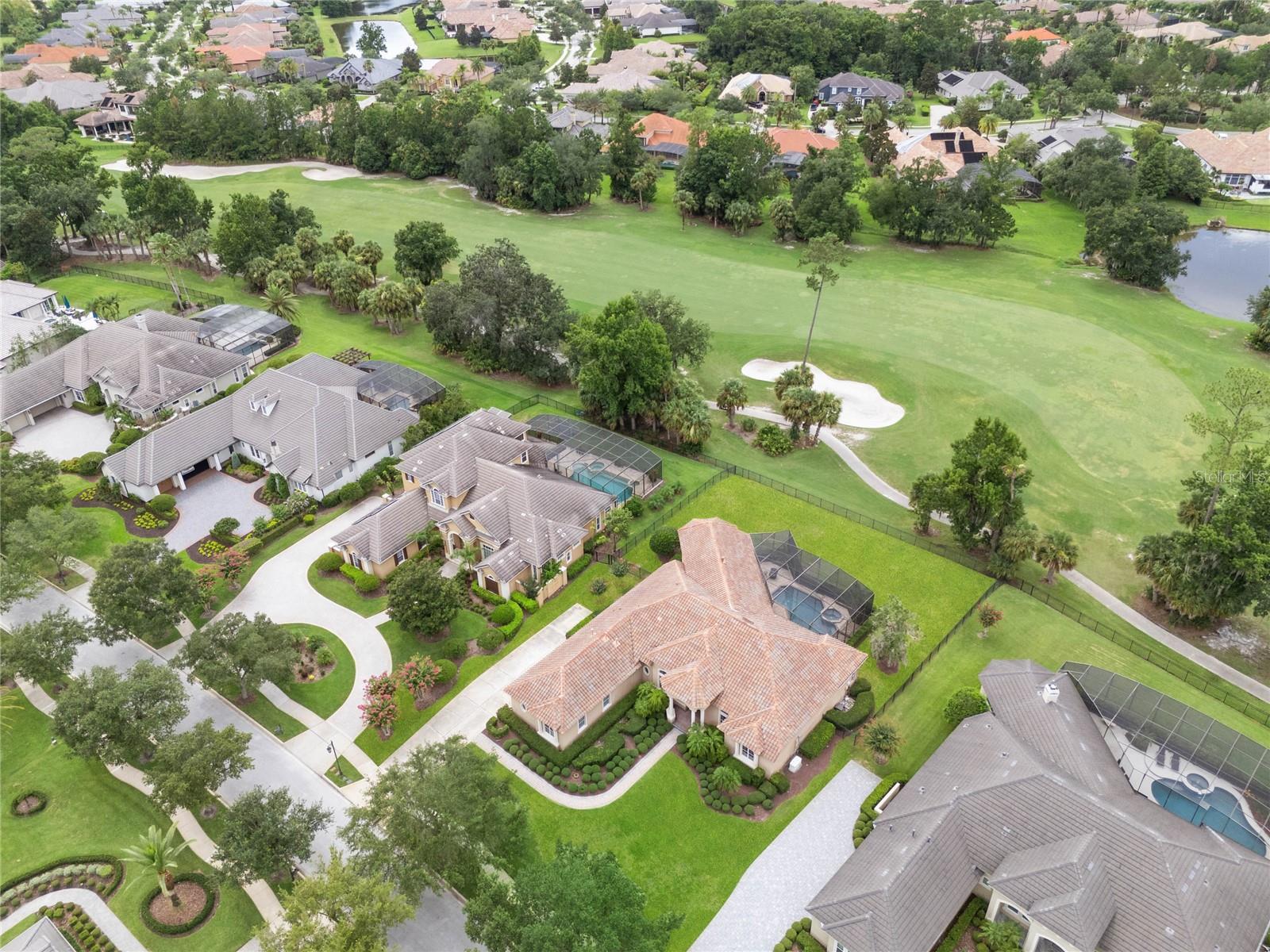 Nestled in the heart of Alaqua Lakes, an exclusive 24/7 guard gated community, this one-story home is on the Legacy/Heathrow Golf Course. The "Capistrano" model luxury home is situated directly on the 4th Fairway, Par 5 of the Legacy/Heathrow Golf Course. This home features spectacular unobstructed golf and lake views. This truly spectacular and unique one-story 3,894 square foot home boasts four bedrooms and four baths in an open floor plan, including a bonus room and office with a custom built-in desk. This home is unique and special due to its golf and water views. This property has been meticulously maintained with multiple upgrades and replacements over the years including a built-in Kitchen Aid Refrigerator, HVAC, Noritz tankless water heater, Jandy remote control for pool and spa, pool pump, back yard fencing, and much more. Upgraded finishes include a gourmet chef's kitchen, natural gas appliances, high ceilings, polished travertine flooring, custom cabinetry, exquisite granite counters in all bathrooms and kitchen, light fixtures, precast stone fireplace, and oversized windows. The primary bedroom and bathroom have been updated and upgraded, offering everything a buyer would expect in a luxury home of this magnitude. Insulation in the attic reduces electric bills, all bedrooms have walk-in closets, and this home includes a backup generator. The pool was resurfaced with PebbleTech in 2023. The outside area of this home is truly an entertainer's dream, with a resort-style heated pool and heated spa with water features and brick paver decking, all fenced in for privacy, perfect for enjoying gorgeous sunsets.