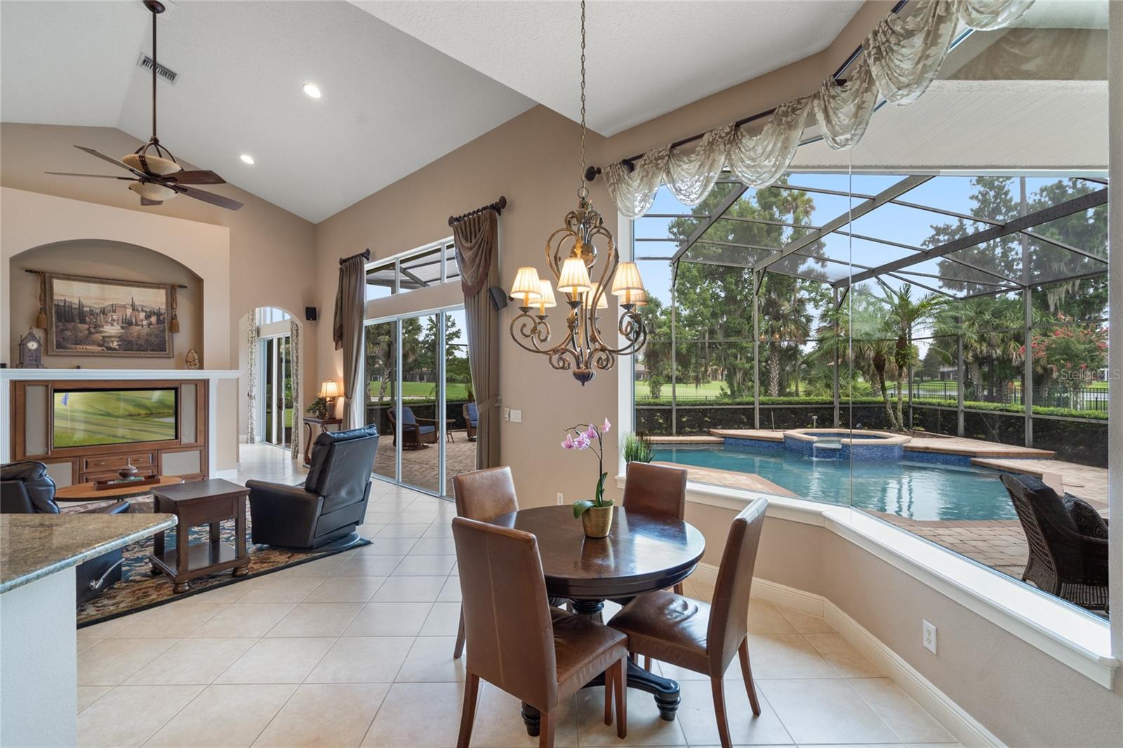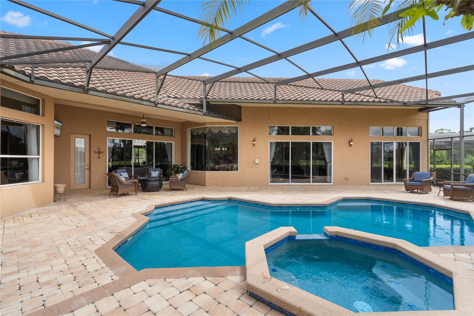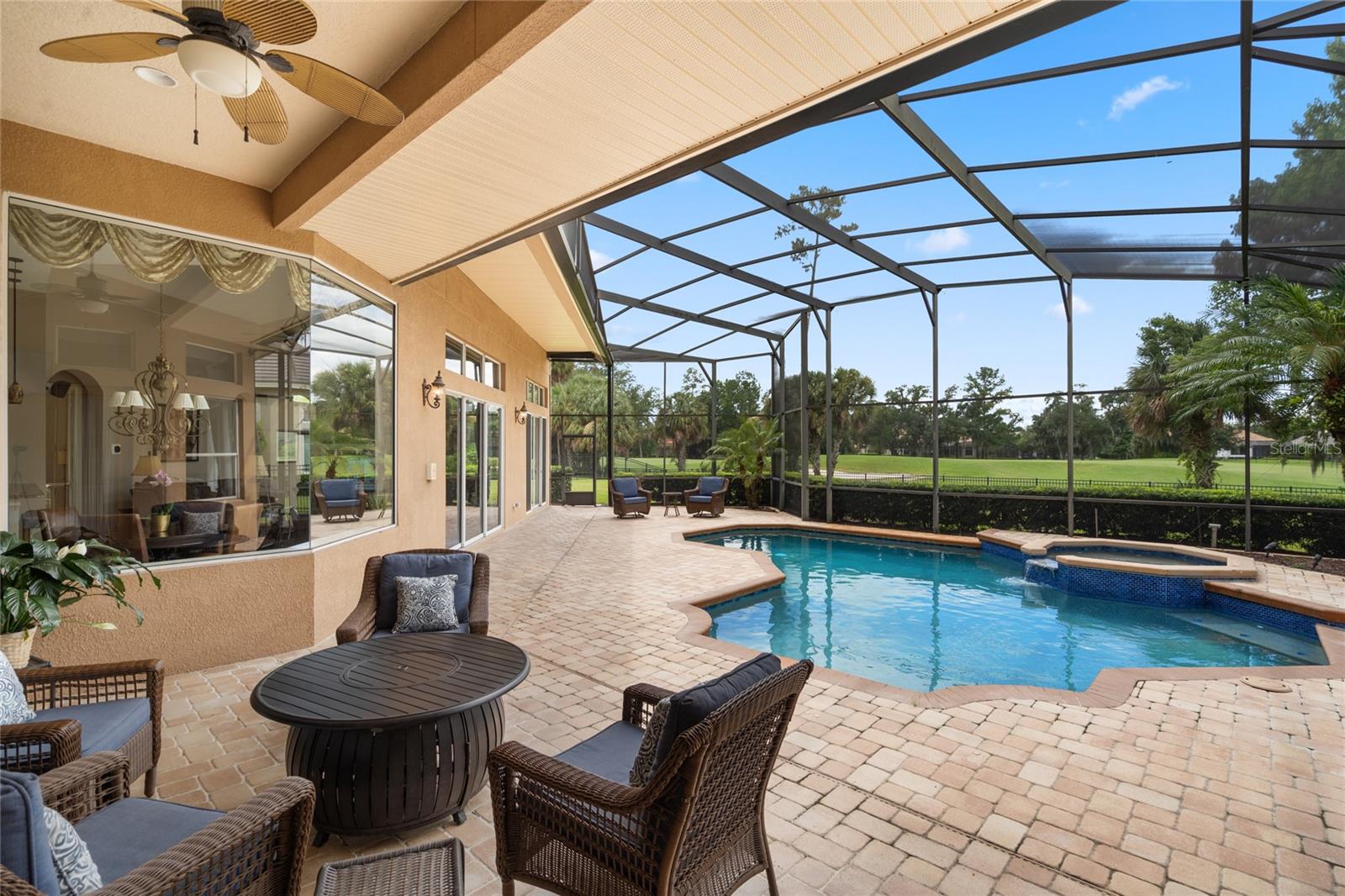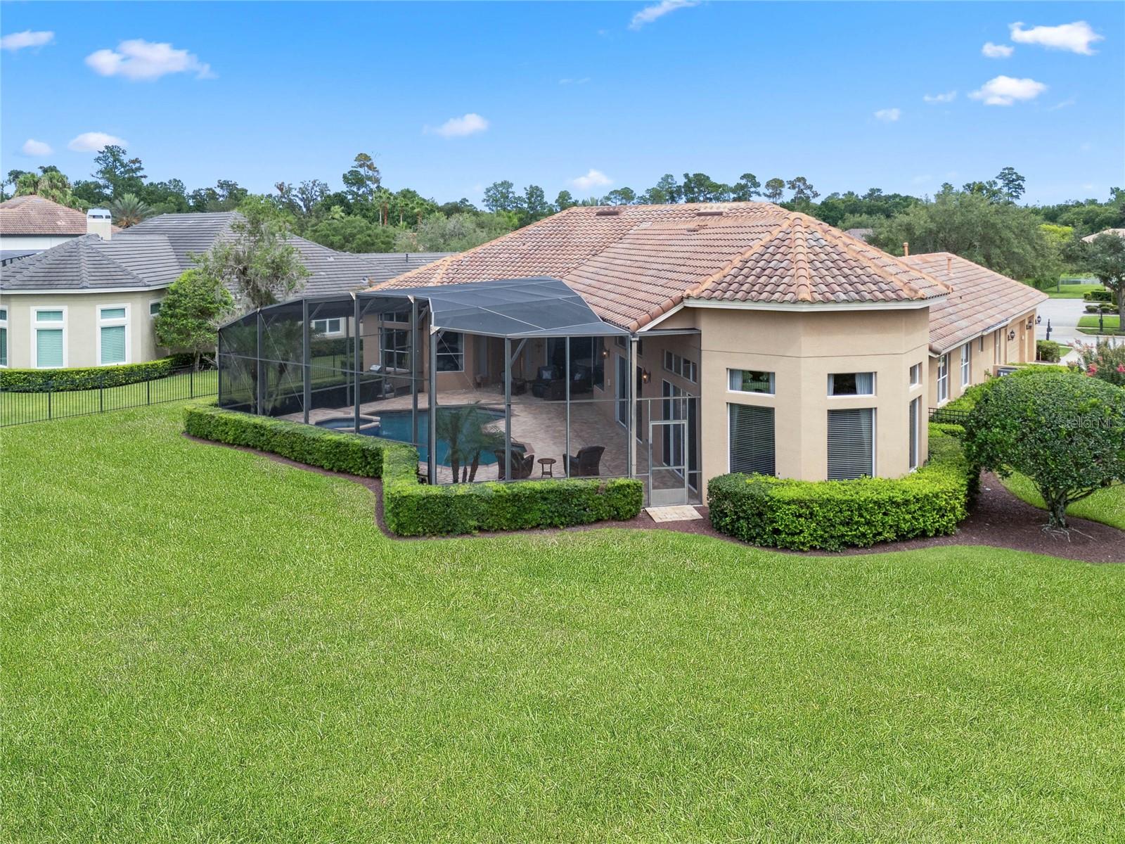 Nestled in the heart of Alaqua Lakes, an exclusive 24/7 guard gated community, this one-story home is on the Legacy/Heathrow Golf Course. The "Capistrano" model luxury home is situated directly on the 4th Fairway, Par 5 of the Legacy/Heathrow Golf Course. This home features spectacular unobstructed golf and lake views. This truly spectacular and unique one-story 3,894 square foot home boasts four bedrooms and four baths in an open floor plan, including a bonus room and office with a custom built-in desk. This home is unique and special due to its golf and water views. This property has been meticulously maintained with multiple upgrades and replacements over the years including a built-in Kitchen Aid Refrigerator, HVAC, Noritz tankless water heater, Jandy remote control for pool and spa, pool pump, back yard fencing, and much more. Upgraded finishes include a gourmet chef's kitchen, natural gas appliances, high ceilings, polished travertine flooring, custom cabinetry, exquisite granite counters in all bathrooms and kitchen, light fixtures, precast stone fireplace, and oversized windows. The primary bedroom and bathroom have been updated and upgraded, offering everything a buyer would expect in a luxury home of this magnitude. Insulation in the attic reduces electric bills, all bedrooms have walk-in closets, and this home includes a backup generator. The pool was resurfaced with PebbleTech in 2023. The outside area of this home is truly an entertainer's dream, with a resort-style heated pool and heated spa with water features and brick paver decking, all fenced in for privacy, perfect for enjoying gorgeous sunsets.