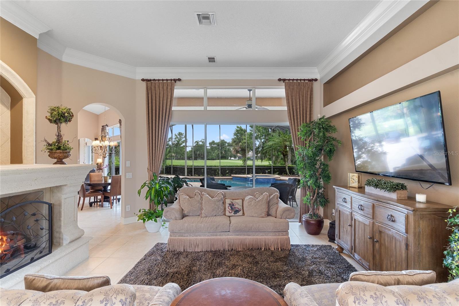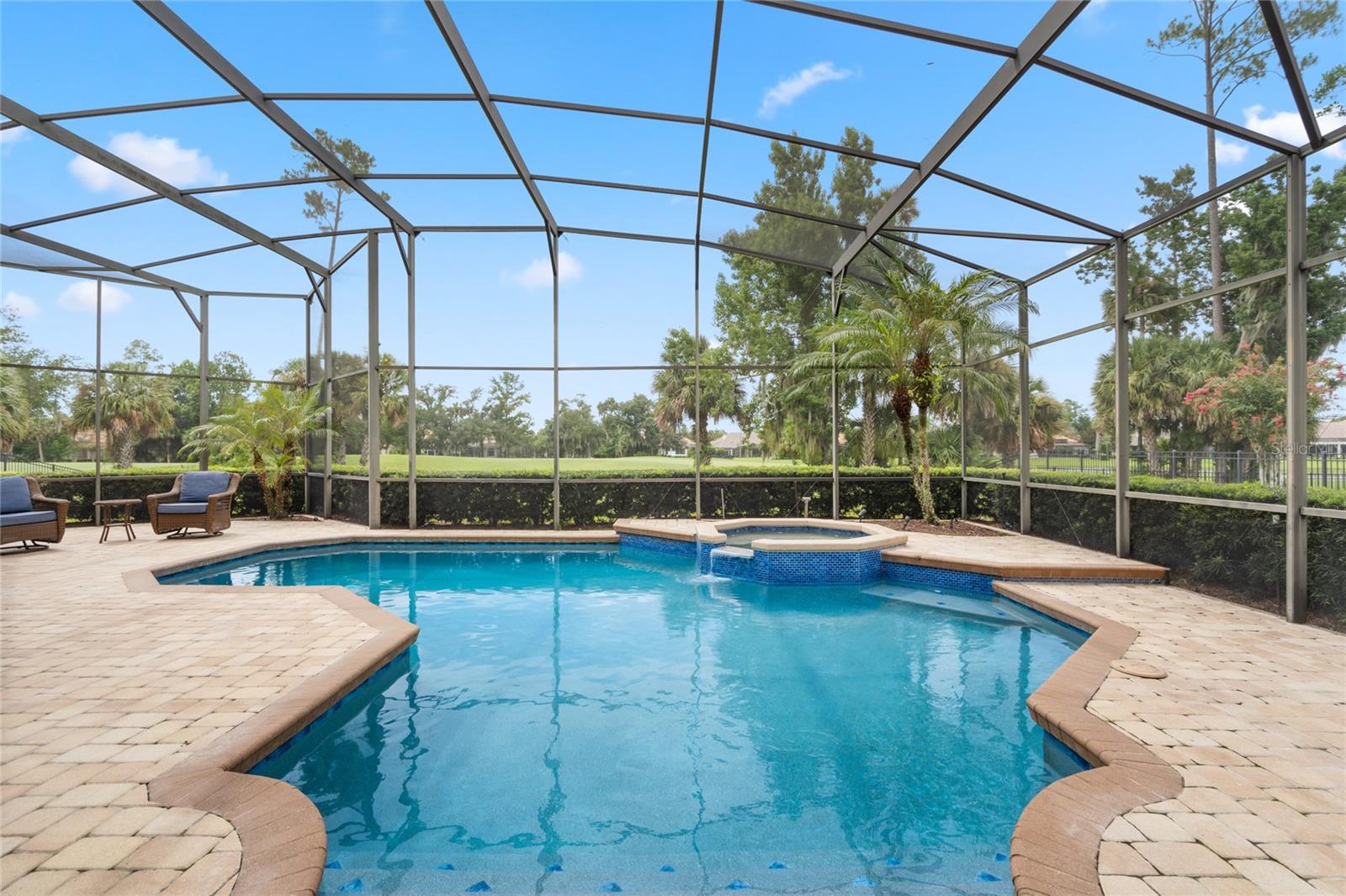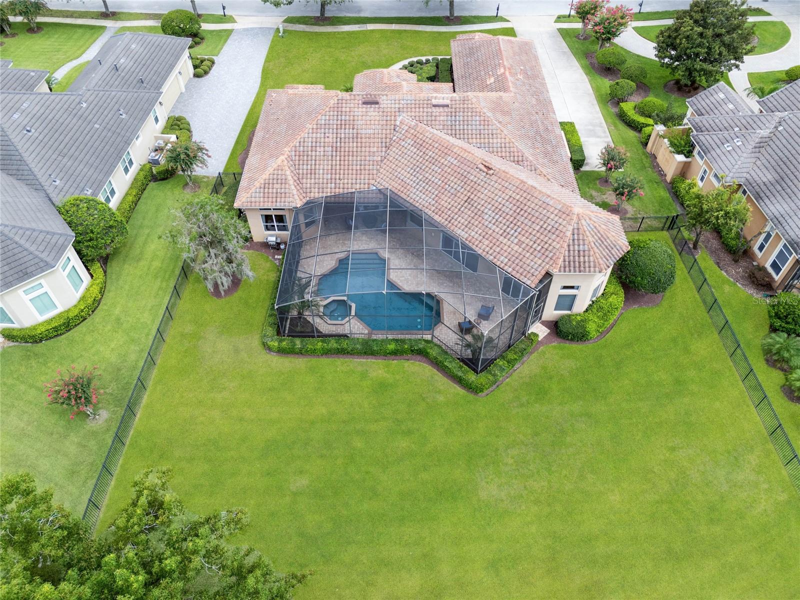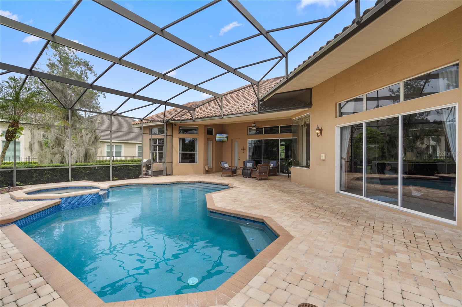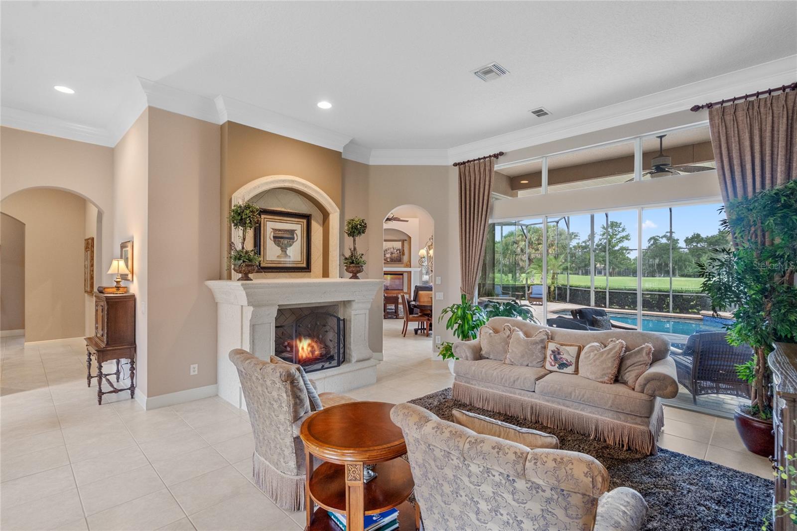 Nestled in the heart of Alaqua Lakes, an exclusive 24/7 guard gated community, this one-story home is on the Legacy/Heathrow Golf Course. The "Capistrano" model luxury home is situated directly on the 4th Fairway, Par 5 of the Legacy/Heathrow Golf Course. This home features spectacular unobstructed golf and lake views. This truly spectacular and unique one-story 3,894 square foot home boasts four bedrooms and four baths in an open floor plan, including a bonus room and office with a custom built-in desk. This home is unique and special due to its golf and water views. This property has been meticulously maintained with multiple upgrades and replacements over the years including a built-in Kitchen Aid Refrigerator, HVAC, Noritz tankless water heater, Jandy remote control for pool and spa, pool pump, back yard fencing, and much more. Upgraded finishes include a gourmet chef's kitchen, natural gas appliances, high ceilings, polished travertine flooring, custom cabinetry, exquisite granite counters in all bathrooms and kitchen, light fixtures, precast stone fireplace, and oversized windows. The primary bedroom and bathroom have been updated and upgraded, offering everything a buyer would expect in a luxury home of this magnitude. Insulation in the attic reduces electric bills, all bedrooms have walk-in closets, and this home includes a backup generator. The pool was resurfaced with PebbleTech in 2023. The outside area of this home is truly an entertainer's dream, with a resort-style heated pool and heated spa with water features and brick paver decking, all fenced in for privacy, perfect for enjoying gorgeous sunsets.