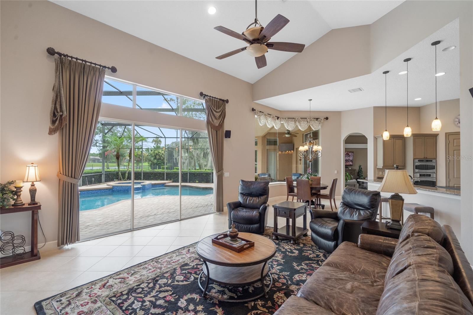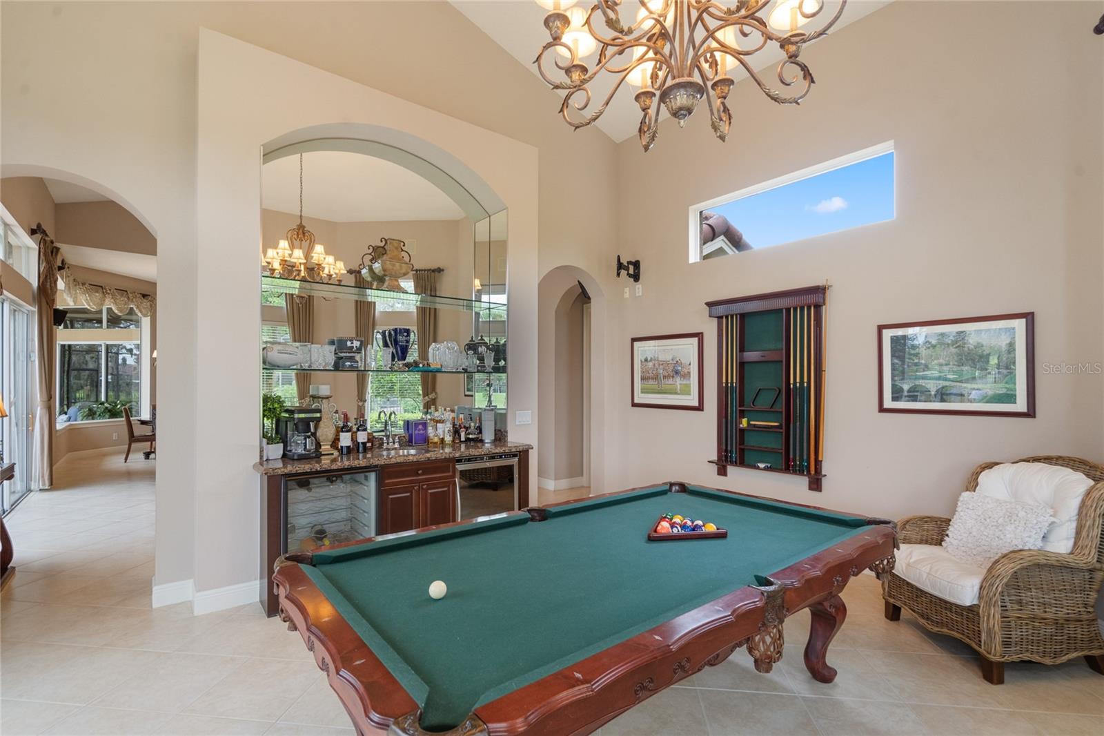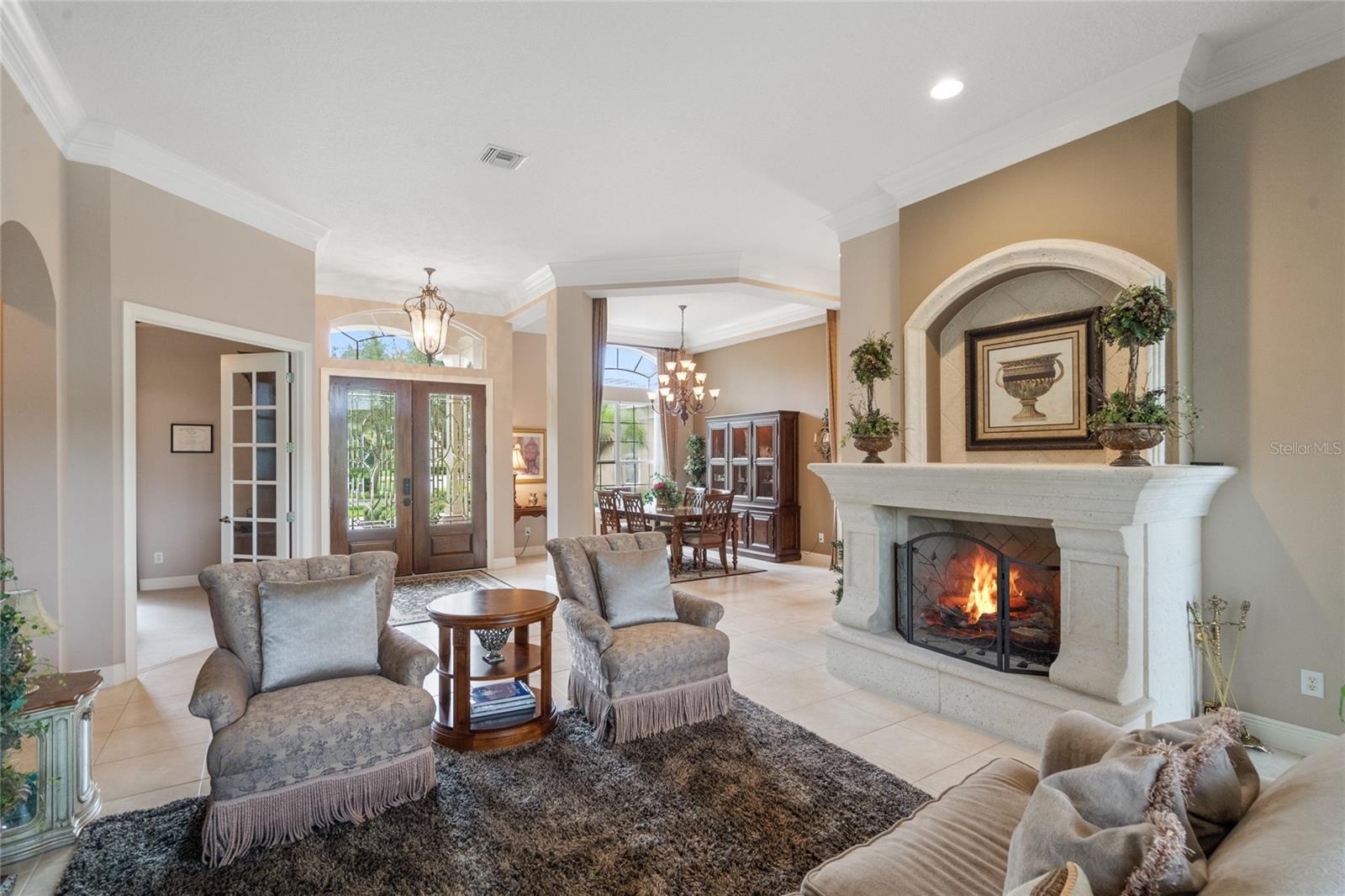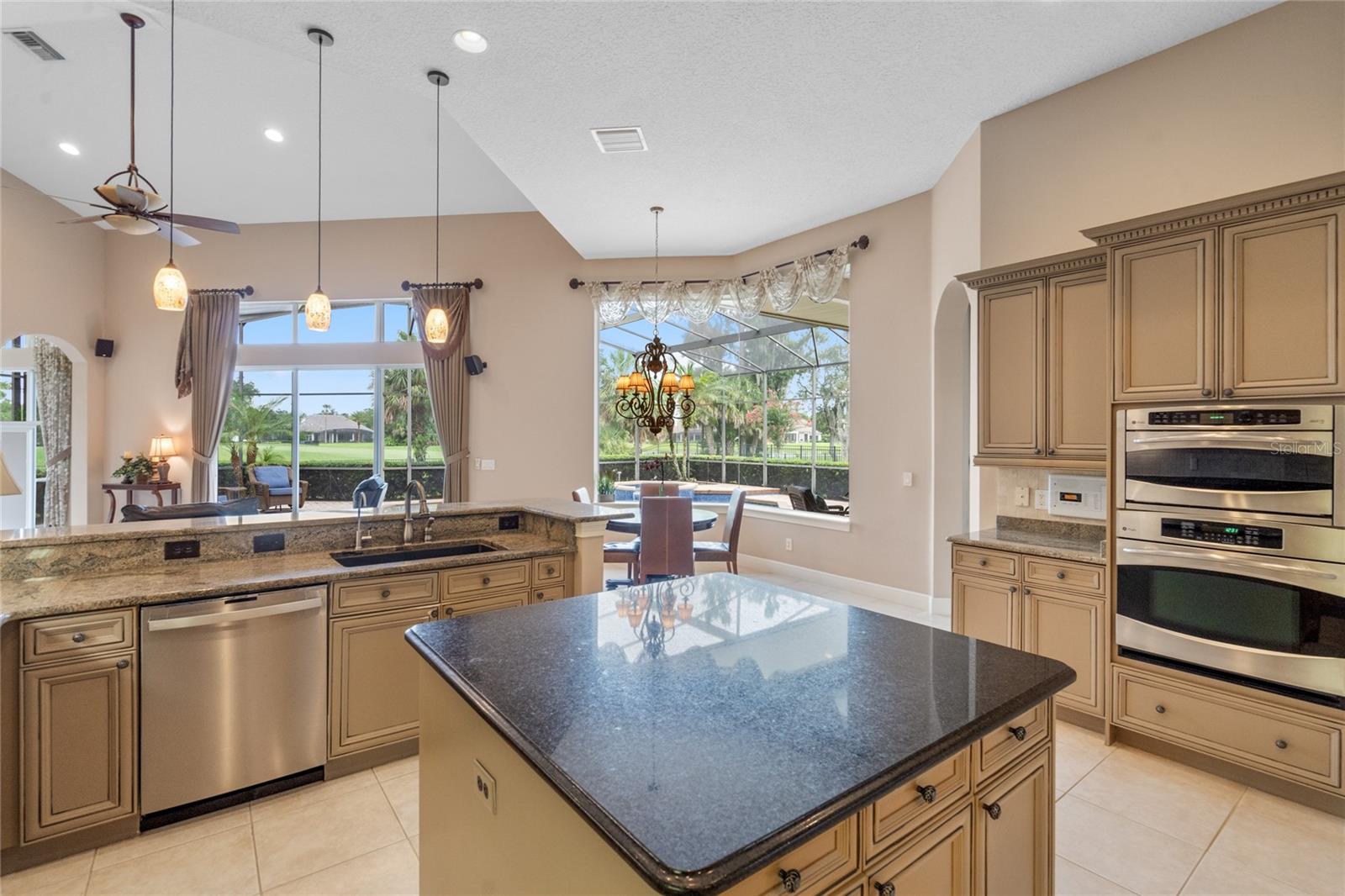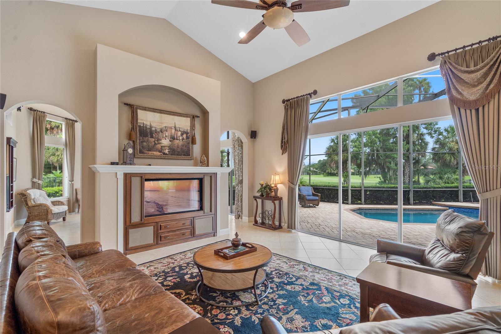 Nestled in the heart of Alaqua Lakes, an exclusive 24/7 guard gated community, this one-story home is on the Legacy/Heathrow Golf Course. The "Capistrano" model luxury home is situated directly on the 4th Fairway, Par 5 of the Legacy/Heathrow Golf Course. This home features spectacular unobstructed golf and lake views. This truly spectacular and unique one-story 3,894 square foot home boasts four bedrooms and four baths in an open floor plan, including a bonus room and office with a custom built-in desk. This home is unique and special due to its golf and water views. This property has been meticulously maintained with multiple upgrades and replacements over the years including a built-in Kitchen Aid Refrigerator, HVAC, Noritz tankless water heater, Jandy remote control for pool and spa, pool pump, back yard fencing, and much more. Upgraded finishes include a gourmet chef's kitchen, natural gas appliances, high ceilings, polished travertine flooring, custom cabinetry, exquisite granite counters in all bathrooms and kitchen, light fixtures, precast stone fireplace, and oversized windows. The primary bedroom and bathroom have been updated and upgraded, offering everything a buyer would expect in a luxury home of this magnitude. Insulation in the attic reduces electric bills, all bedrooms have walk-in closets, and this home includes a backup generator. The pool was resurfaced with PebbleTech in 2023. The outside area of this home is truly an entertainer's dream, with a resort-style heated pool and heated spa with water features and brick paver decking, all fenced in for privacy, perfect for enjoying gorgeous sunsets.