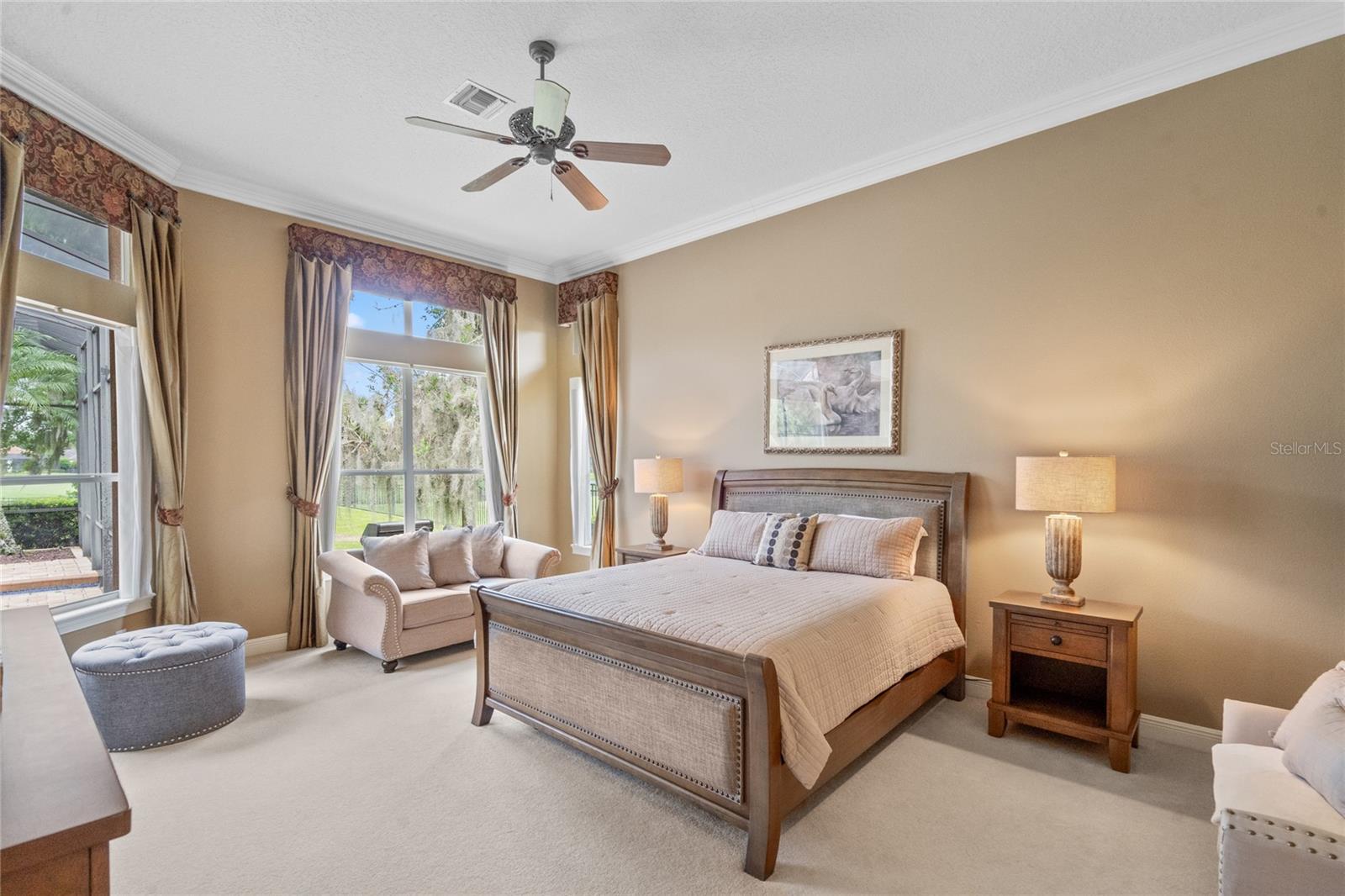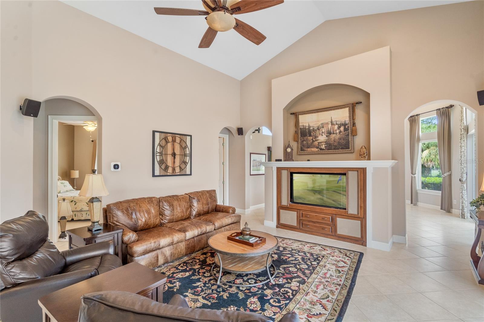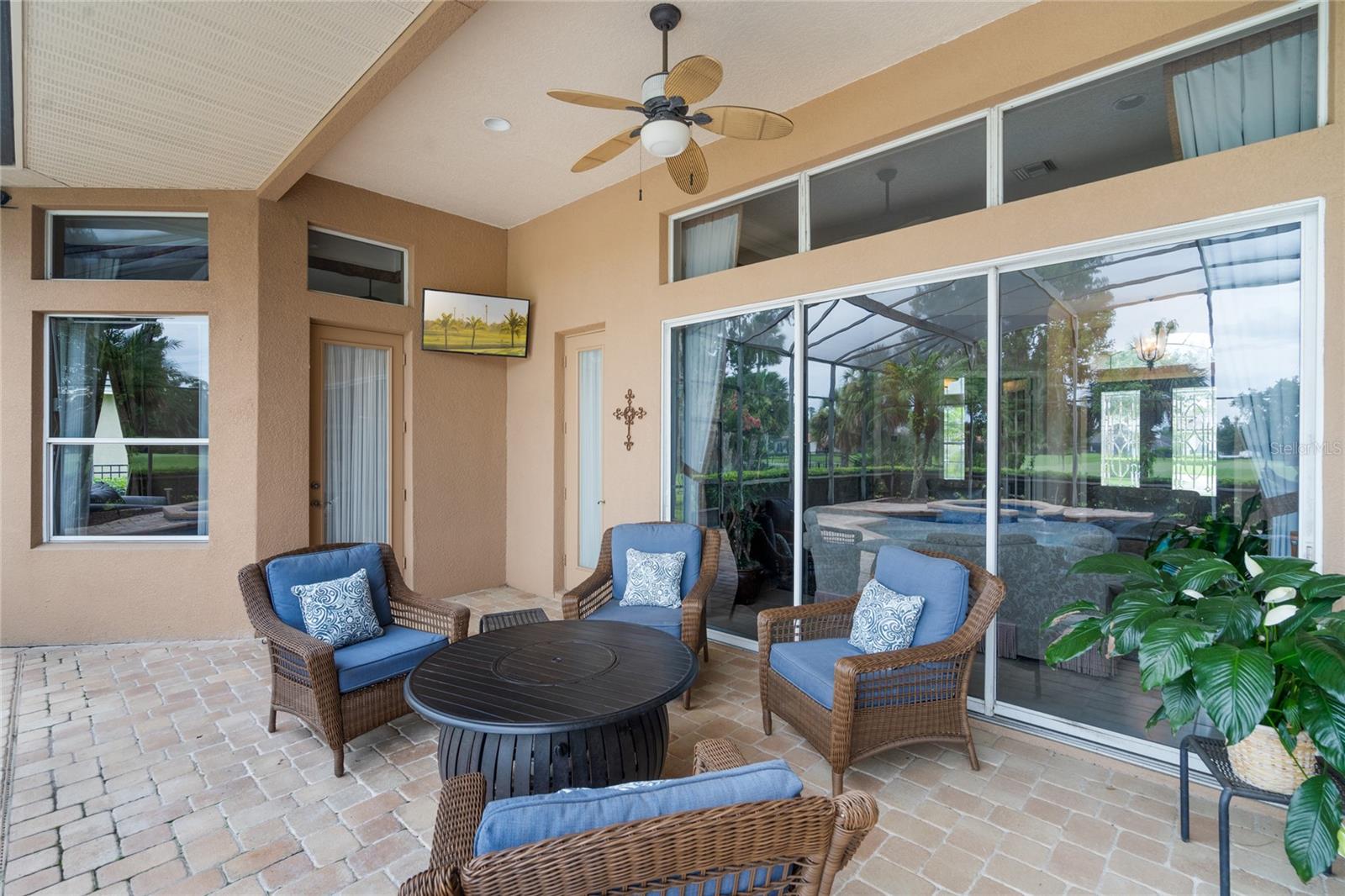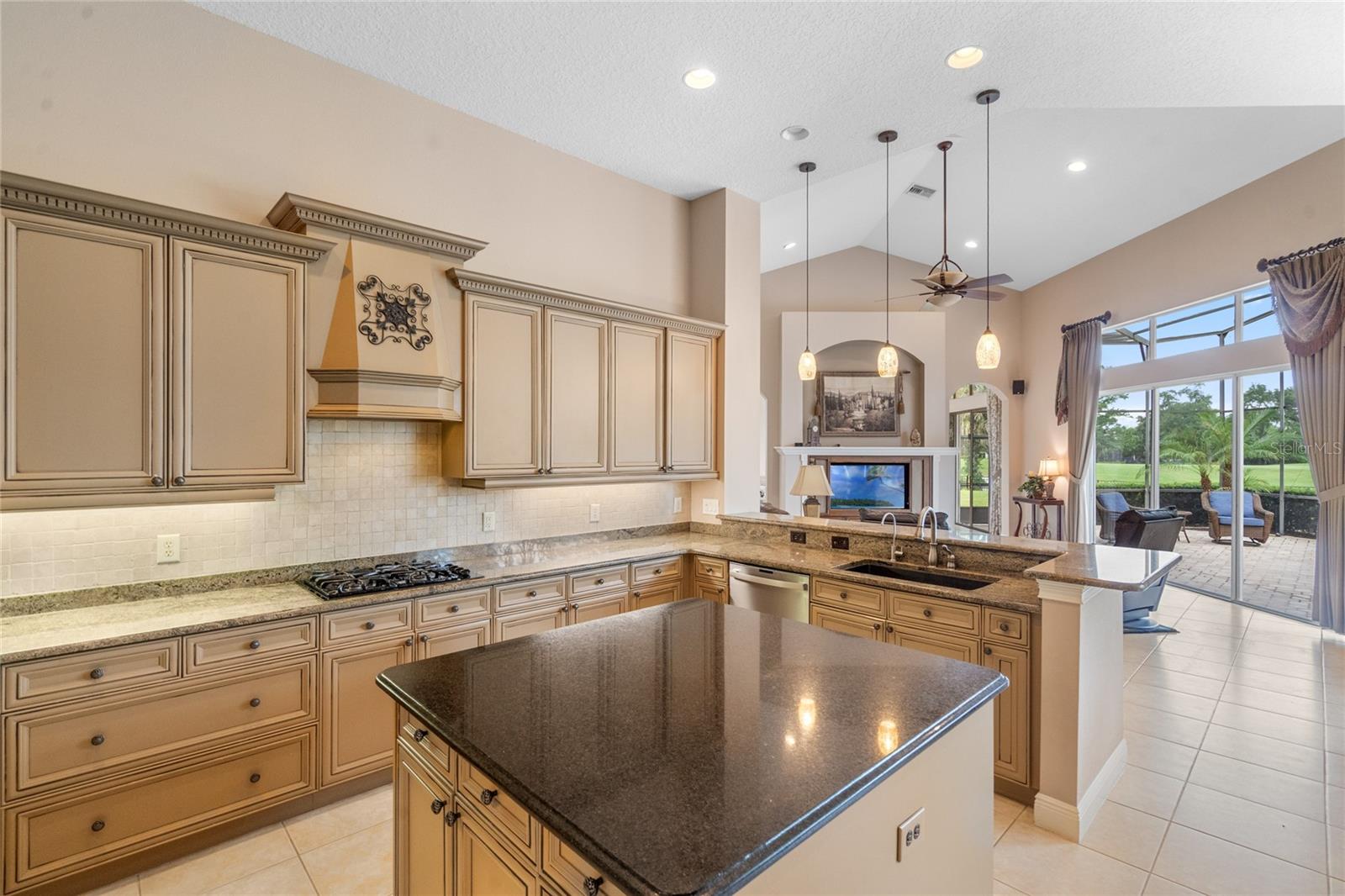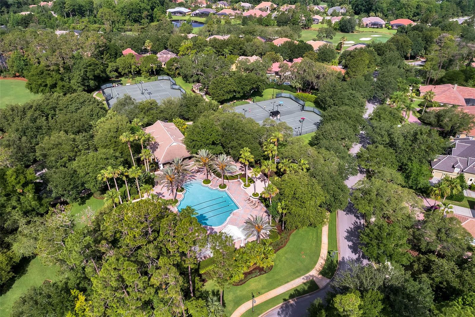 Nestled in the heart of Alaqua Lakes, an exclusive 24/7 guard gated community, this one-story home is on the Legacy/Heathrow Golf Course. The "Capistrano" model luxury home is situated directly on the 4th Fairway, Par 5 of the Legacy/Heathrow Golf Course. This home features spectacular unobstructed golf and lake views. This truly spectacular and unique one-story 3,894 square foot home boasts four bedrooms and four baths in an open floor plan, including a bonus room and office with a custom built-in desk. This home is unique and special due to its golf and water views. This property has been meticulously maintained with multiple upgrades and replacements over the years including a built-in Kitchen Aid Refrigerator, HVAC, Noritz tankless water heater, Jandy remote control for pool and spa, pool pump, back yard fencing, and much more. Upgraded finishes include a gourmet chef's kitchen, natural gas appliances, high ceilings, polished travertine flooring, custom cabinetry, exquisite granite counters in all bathrooms and kitchen, light fixtures, precast stone fireplace, and oversized windows. The primary bedroom and bathroom have been updated and upgraded, offering everything a buyer would expect in a luxury home of this magnitude. Insulation in the attic reduces electric bills, all bedrooms have walk-in closets, and this home includes a backup generator. The pool was resurfaced with PebbleTech in 2023. The outside area of this home is truly an entertainer's dream, with a resort-style heated pool and heated spa with water features and brick paver decking, all fenced in for privacy, perfect for enjoying gorgeous sunsets.