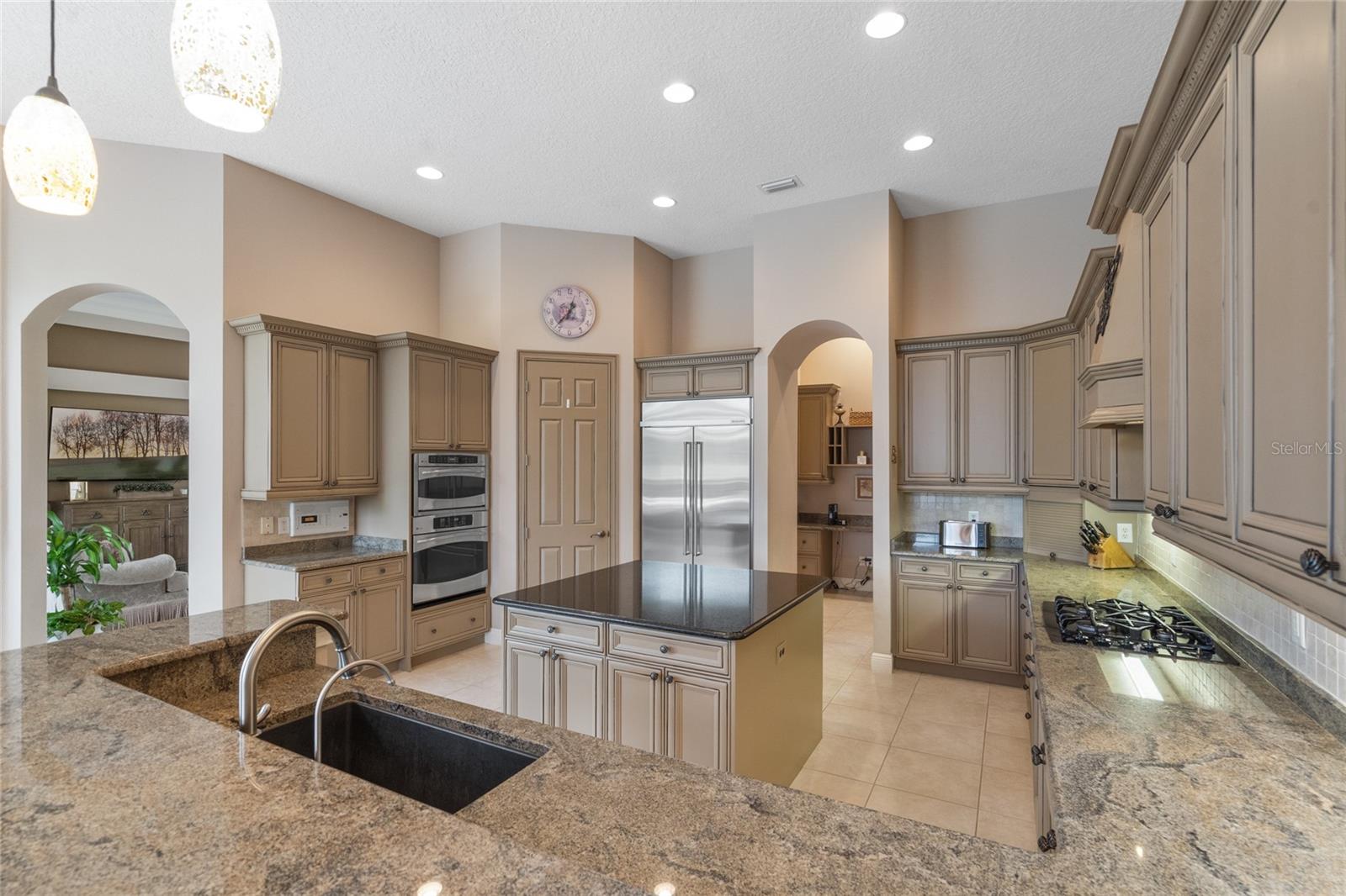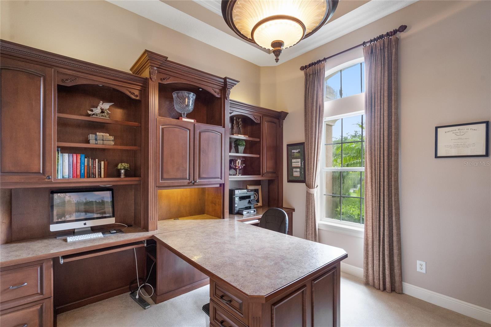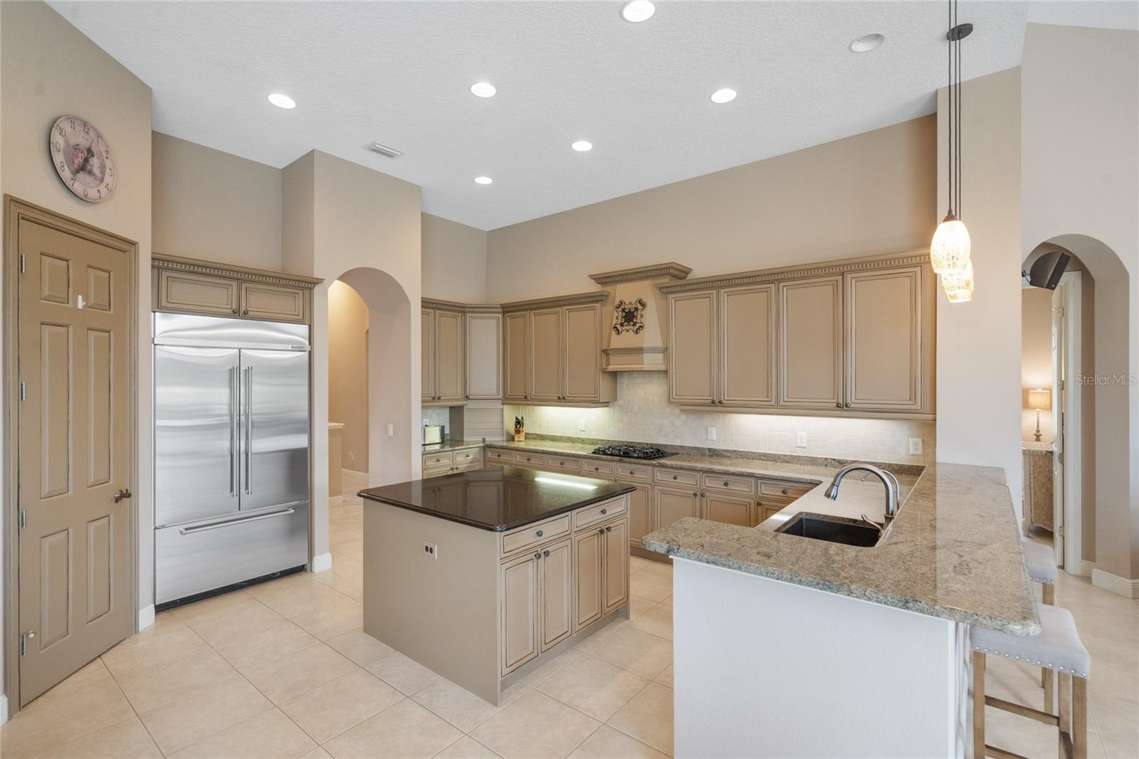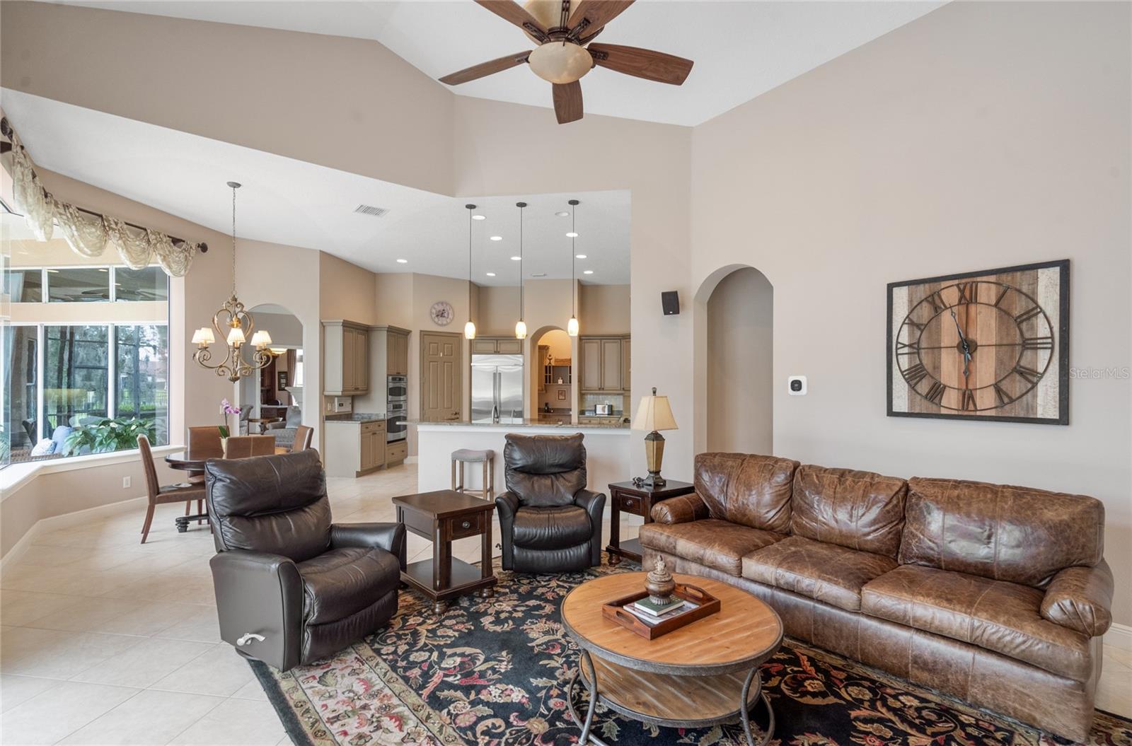 Nestled in the heart of Alaqua Lakes, an exclusive 24/7 guard gated community, this one-story home is on the Legacy/Heathrow Golf Course. The "Capistrano" model luxury home is situated directly on the 4th Fairway, Par 5 of the Legacy/Heathrow Golf Course. This home features spectacular unobstructed golf and lake views. This truly spectacular and unique one-story 3,894 square foot home boasts four bedrooms and four baths in an open floor plan, including a bonus room and office with a custom built-in desk. This home is unique and special due to its golf and water views. This property has been meticulously maintained with multiple upgrades and replacements over the years including a built-in Kitchen Aid Refrigerator, HVAC, Noritz tankless water heater, Jandy remote control for pool and spa, pool pump, back yard fencing, and much more. Upgraded finishes include a gourmet chef's kitchen, natural gas appliances, high ceilings, polished travertine flooring, custom cabinetry, exquisite granite counters in all bathrooms and kitchen, light fixtures, precast stone fireplace, and oversized windows. The primary bedroom and bathroom have been updated and upgraded, offering everything a buyer would expect in a luxury home of this magnitude. Insulation in the attic reduces electric bills, all bedrooms have walk-in closets, and this home includes a backup generator. The pool was resurfaced with PebbleTech in 2023. The outside area of this home is truly an entertainer's dream, with a resort-style heated pool and heated spa with water features and brick paver decking, all fenced in for privacy, perfect for enjoying gorgeous sunsets.