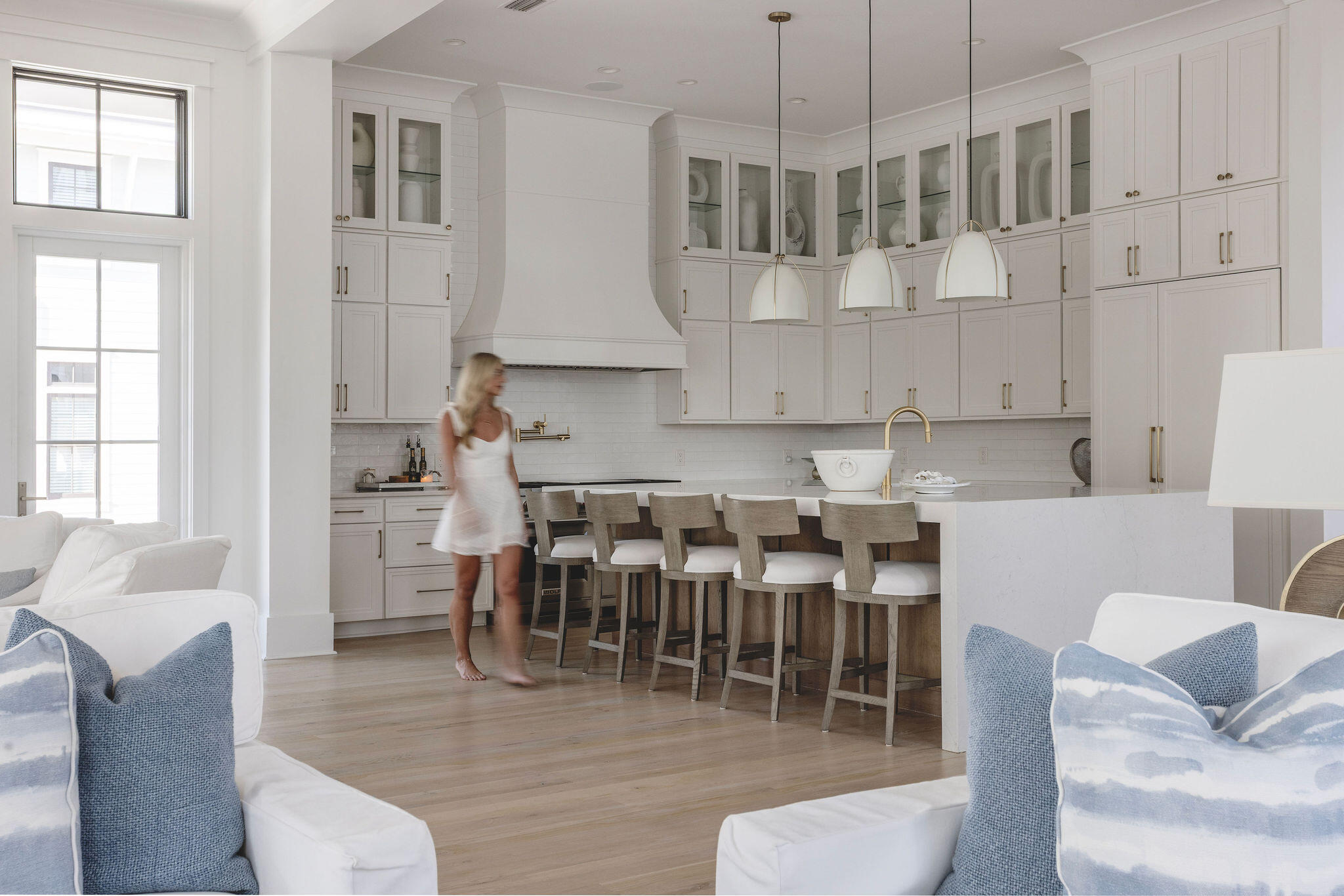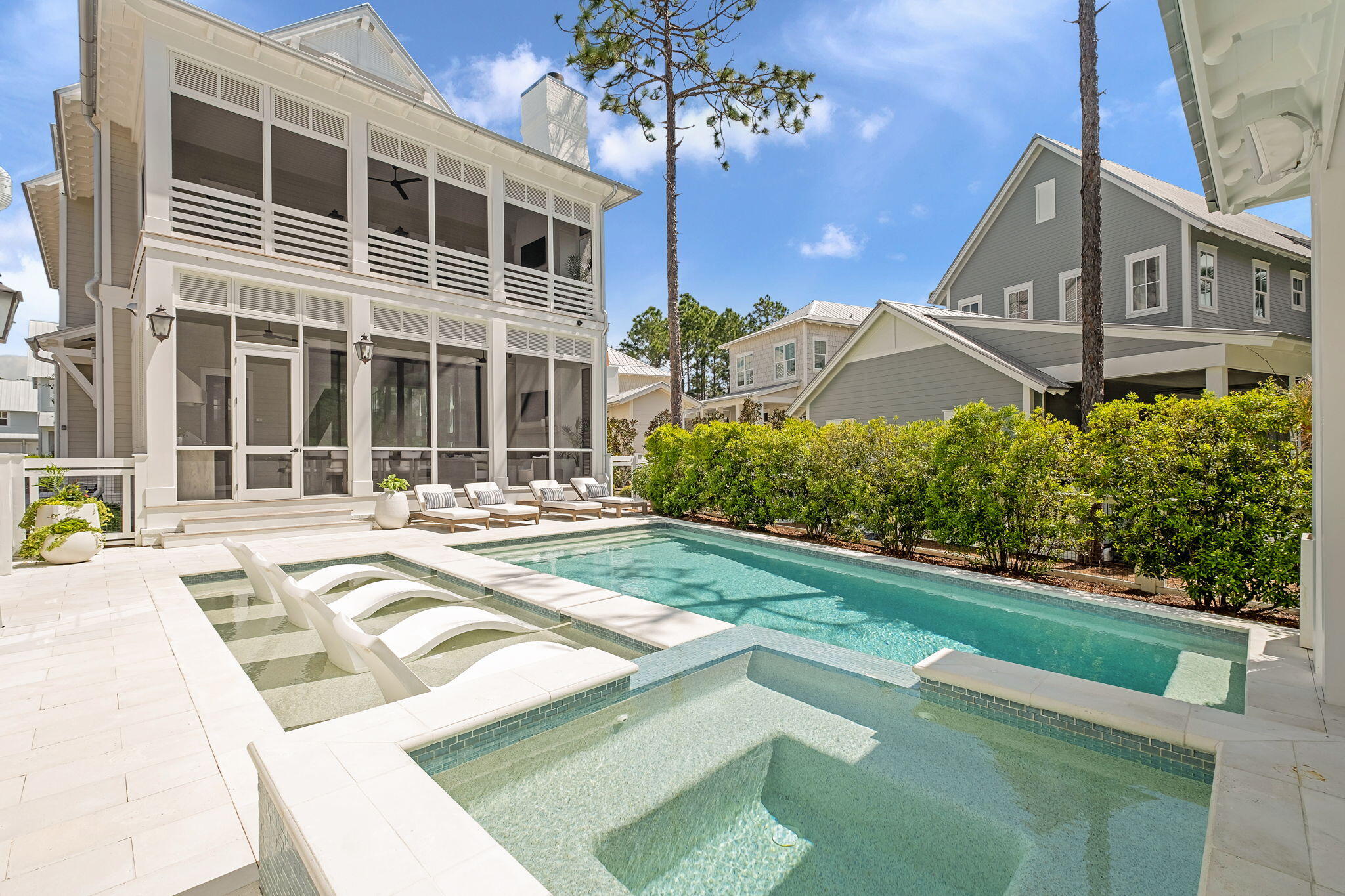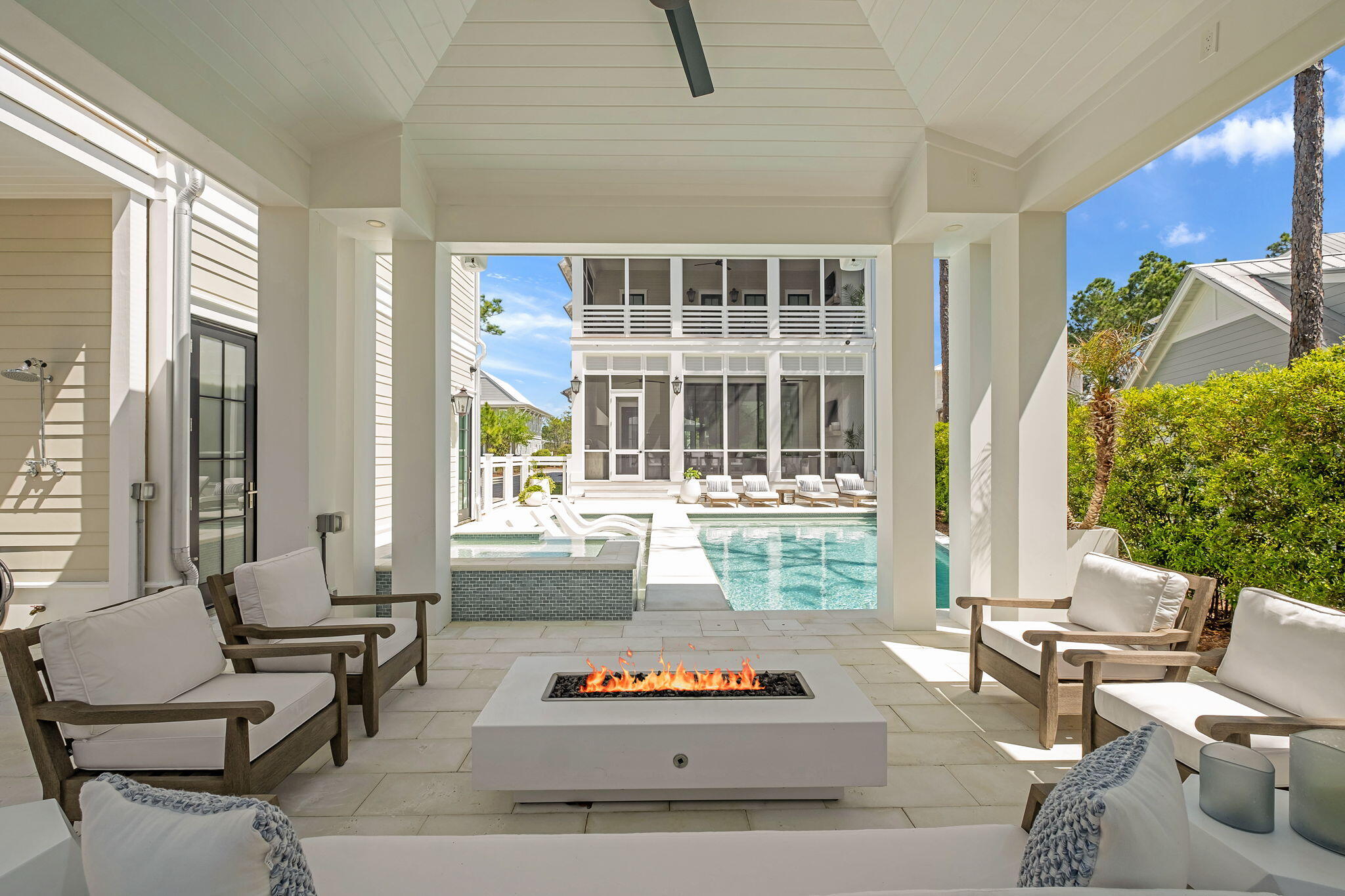 In WaterColor, the most compelling homes rarely announce themselves. They reveal their intention gradually, through proportion, material, and the quiet confidence of thoughtful design. At 565 East Royal Fern, that restraint is immediately evident. Built by Borges Brooks Builders and designed by TS Adams, the residence reads less like a vacation home and more like a carefully composed coastal compound, where architecture, craftsmanship, and livability were considered in equal measure.The interiors are grounded in warmth and texture. Oak floors by Seashore Flooring run throughout, softening the scale of the home while complementing a restrained palette of whites and natural woods. Light moves easily across the living spaces, filtered through expansive openings and framed by subtle architectural details. Several furnishings were custom designed by the homeowner and executed by Amish craftsmen, introducing a quiet layer of authenticity that reinforces the home's tailored, intentional feel.The kitchen is both sculptural and functional, centered around a waterfall island that anchors the space. Dome pendants add a clean architectural focal point, while a 60-inch Wolf range and Liebherr refrigerator elevate the appliance package without disrupting the home's understated tone. In the carriage house, quartz countertops and coordinated finishes continue the same level of detail, ensuring the secondary living spaces feel fully integrated with the main residence.With eight bedrooms, including the private carriage house, the property lives as a true compound. The primary suite is positioned as a retreat, complete with a spa-style bathroom featuring a soaking tub, electric fireplace, dual closets, and direct access to a private patio. Guest accommodations are thoughtfully distributed, allowing for both privacy and flexibility when hosting extended family and visitors.Construction details further distinguish the home. The slab is elevated and foam insulated, a deliberate structural decision that enhances stability and helps prevent floor movement over time. Real stone in the downstairs guest bathroom reinforces the emphasis on authentic materials, while EPAY decking across the outdoor living areas was selected for long-term durability in the coastal environment.Outdoor spaces extend the architecture rather than compete with it. A resort-style pool and covered pavilion create layered gathering areas, allowing the home to transition naturally between quiet mornings and larger-scale entertaining.At 565 East Royal Fern, the result is not simply scale, but composition. A WaterColor residence defined by intention, craftsmanship, and a quieter, more enduring interpretation of coastal luxury.