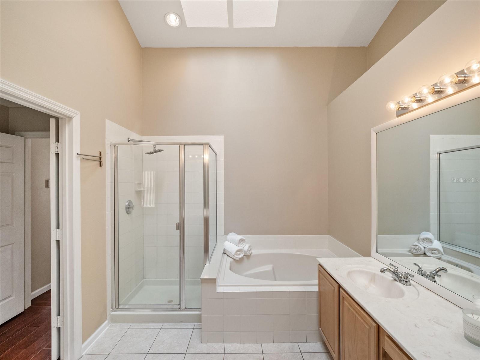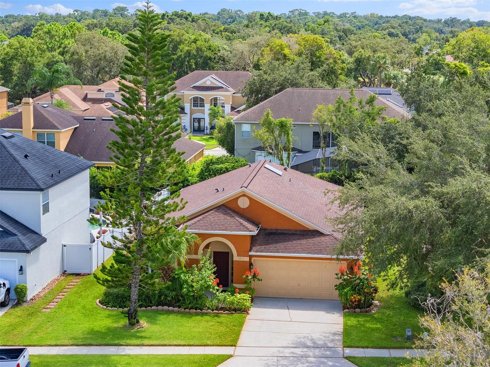 Priced reduced and the seller will credit the buyer $5,000 at Closing! Explore this move-in ready, three-bed, two-bath home located in Huntington Pointe, a Lake Mary community featuring a community pool, clubhouse and parks and zoned for the best schools in town. This open floor plan was extended during construction and boasts over 2,040 square feet of living space. Upon entry, soaring vaulted ceilings introduce the living and dining rooms while offering a glimpse of the kitchen and family room beyond. The primary suite enjoys a private entry and skylights in the luxurious bath, complete with a soaking tub and a separate glass-enclosed shower. Newer appliances grace the kitchen, which opens to the oversized family room. Bedroom two is enormous and has a large walk-in closet, thanks to a builder modification that combined two bedrooms into this one, oversized suite. Bedroom three is a standard size while the laundry room offers plenty of space and storage. A newer roof and updated HVAC are welcome accouterments, as is the recent exterior paint. A generous two-car garage and a private backyard complete this wonderful Lake Mary offering.